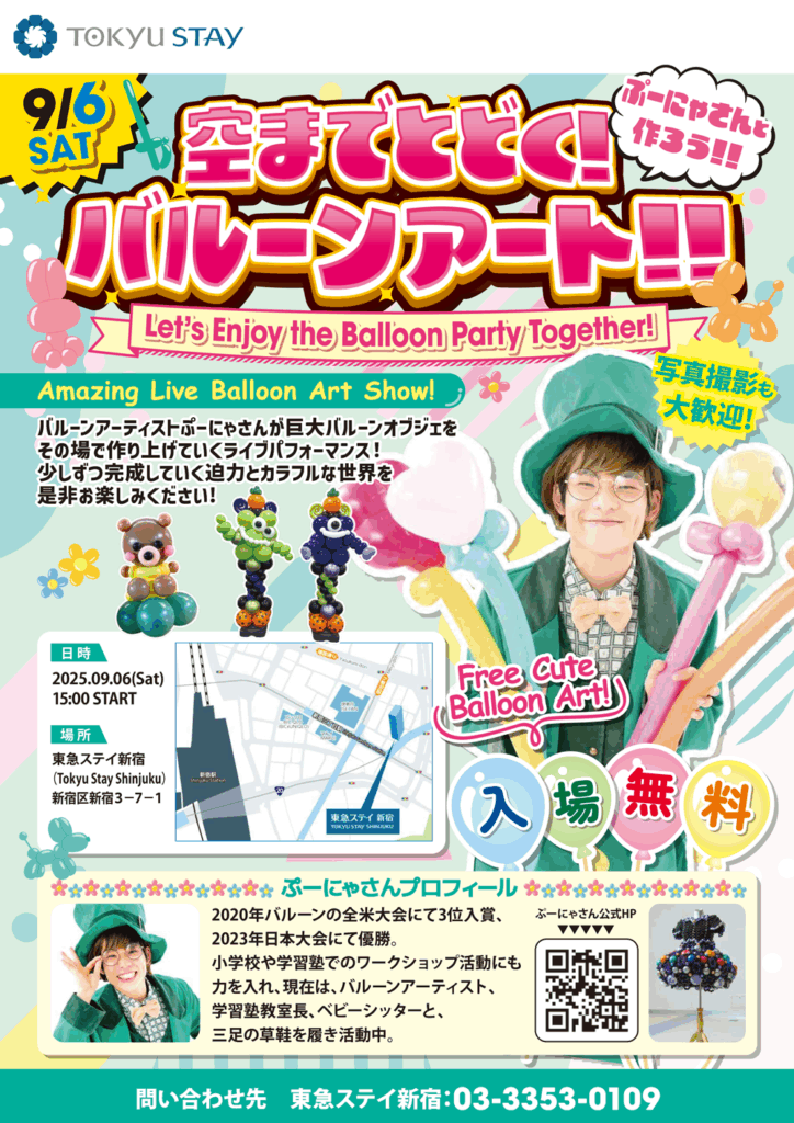 東急ステイ新宿にて、人気バルーンアーティストぷーにゃさんによるスペシャルイベント「空までとどく!バルーンアート!!」が開催されます。